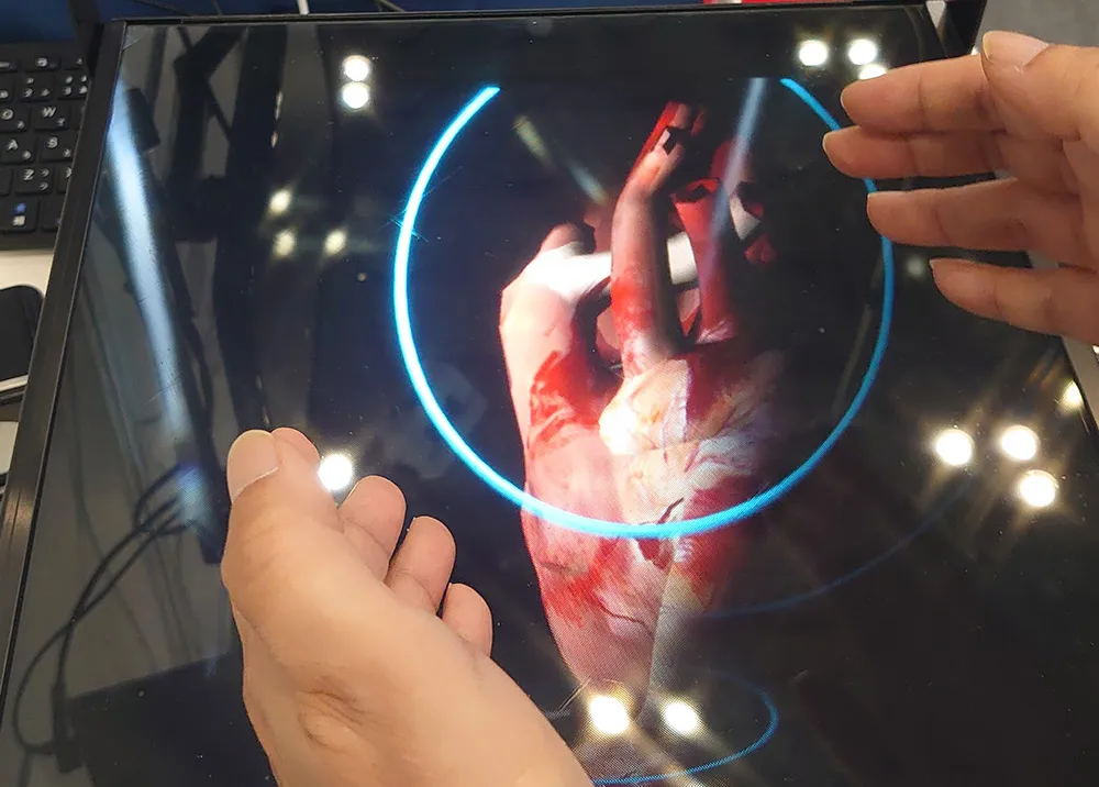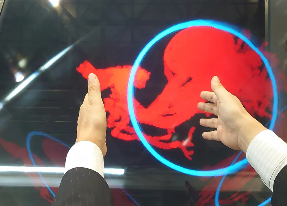まず10.4インチの空中ディスプレイを体験した。真正面に立つと浮かび上がる3D映像…これだけで面白さがあるが、この3Dインターフェイスは、浮かび上がった映像を掴んで回転させたり、移動させたり、拡大・縮小することができる。今回映し出されたのは心臓。手の中に心臓がある感覚を味わうことができる。