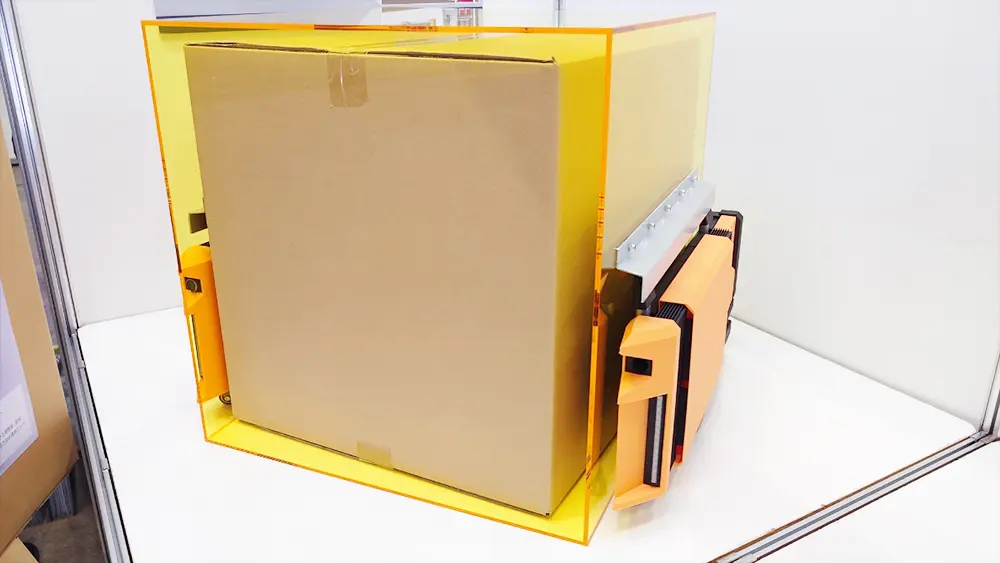床下へはエレベータで荷物を上下させ、床下空間での搬送は、天井高さが低い場所で動くことを想定して開発された「コの字」型の運搬ロボットが活躍し、自動で収納する。荷物を収納するボックスは「パケット」と呼ばれ、対応する荷物の最大寸法はW450mm×D450mm×H470mm、重さは25kg。2Lペットボトル6本入りケース2箱の収納が可能だ。一般的な住居では16個程度のパケットが使用できるという。