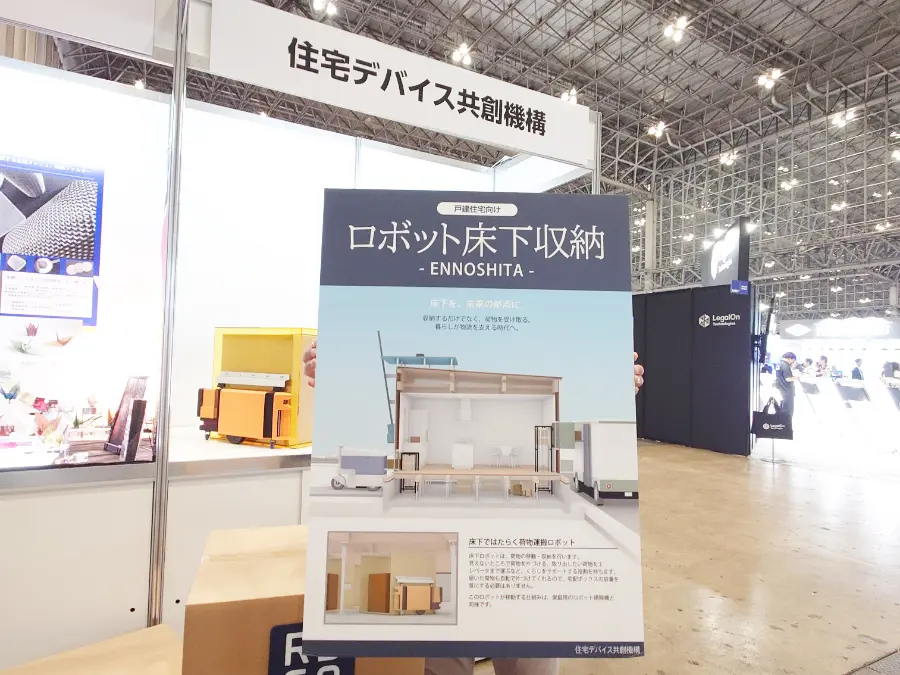 住宅デバイス共創機構は、無人配送時代に対応した新しい住宅の在り方を提案。展示会初出展となるCEATEC 2025で、住宅の床下空間とロボットを活用した自動倉庫システム「ENNOSHITA」を発表した。使わない荷物の保管・出し入れや、配達物の仕分け・収納をロボットが自動で行い、不在時の「置き配」が抱える課題も解決する。無人自動配送ロボットの普及が見込まれる未来の先取りが狙いだ。