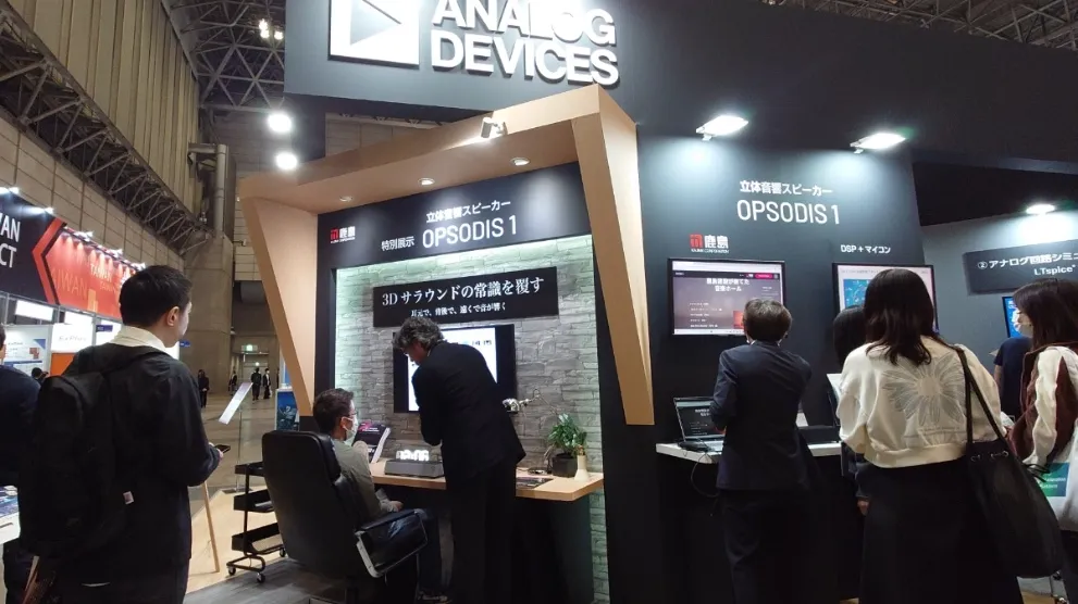 アナログ・デバイセズ株式会社はDSPが採用された鹿島建設の立体音響スピーカー「OPSODIS 1」を出展。
