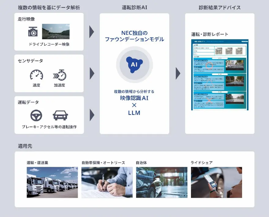走行映像(ドライブレコーダー映像)、速度・加速度を測るセンサデータ、ブレーキ・アクセル等の運転データなど複数の情報を基に、運転診断AIである「映像認識AI×LLM」が分析。運転・診断レポートとして改善案を提案する。