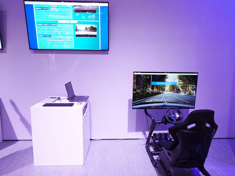 映像に映った数メートルの距離をドライバーとして運転、通常起こりうる様々な事故発生要因(車の飛び出し)もあり、走行環境をAI診断。結果が文章と映像で画面に映し出され改善策を提示する。