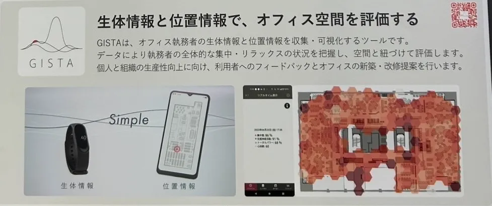 「GISTA®」は、オフィス執務者の心身の状態と位置情報を測定し、データ化。その組み合わせによって、オフィスの場所ごとの集中度等が見える化されるため、集中を向上させる・低減させる要因を分析可能。そこから、利用者の生産性を高めるための執務スペースレイアウトの検討や改修に向けた提案を行う。