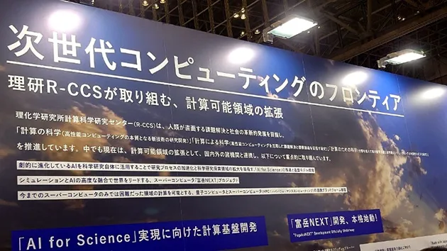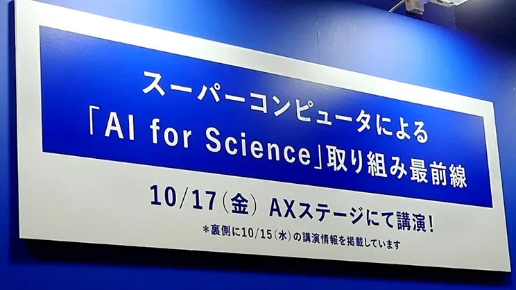 国立研究開発法人理化学研究所計算科学研究センターは、スーパーコンピュータ「富岳」の後継「富岳NEXT」プロジェクト、科学技術にAIを活用して研究プロセスの加速化と科学研究探索領域の拡大を目指す「AI for Science(AIによる科学)」の推進と基本モデル開発などの取り組みを中心に紹介。AXパークステージでは15日、17日で全8講演を行い、AI for Scienceの最先端の取り組みについて研究者が解説した。