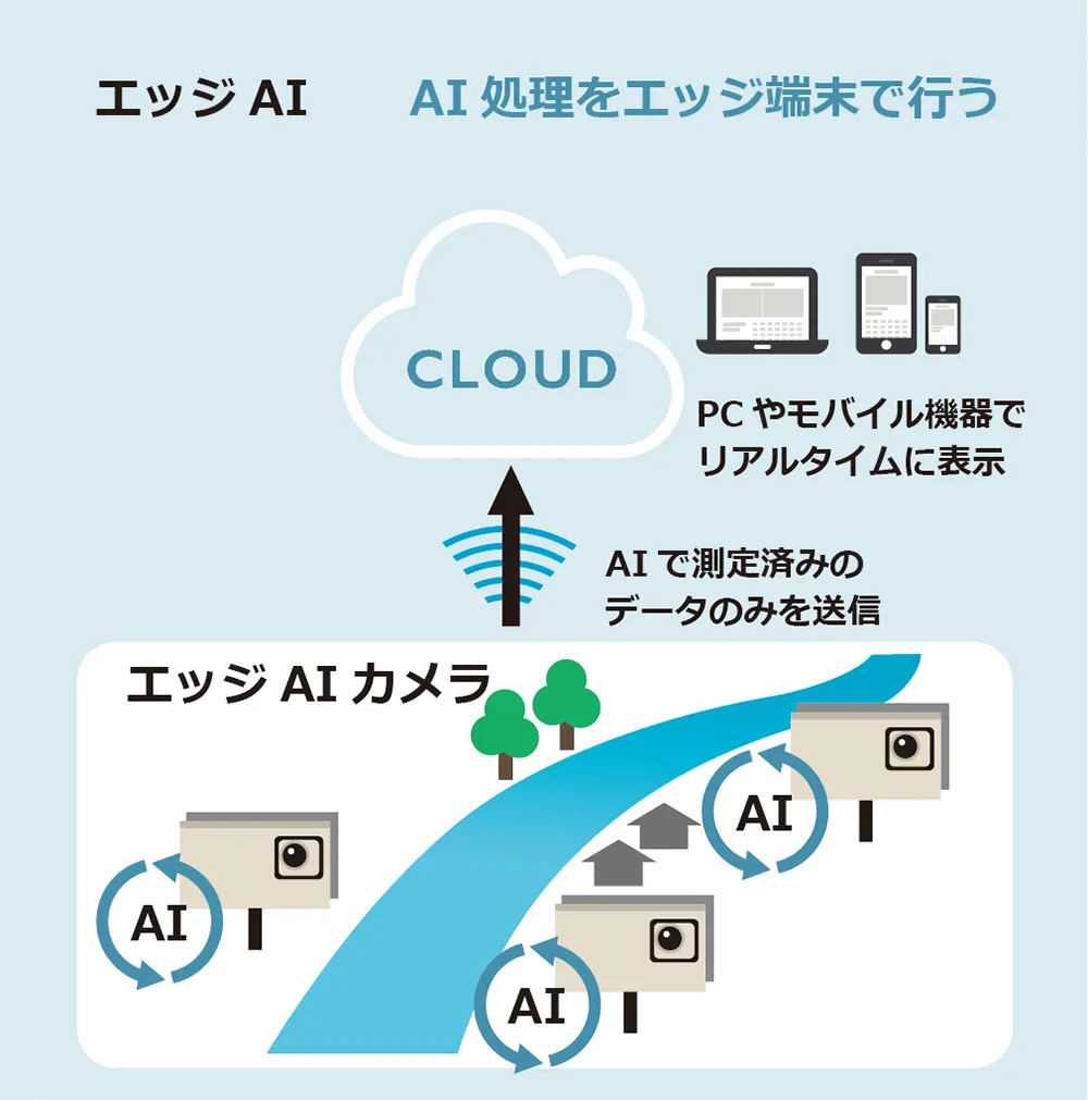 本製品ではカメラ端末に搭載したAIが現場で画像を解析し、検出した水位データのみをクラウドサーバーへ伝送している。リアルタイムでの情報処理が可能なため即時性のあるデータが取得できるほか、データ通信量の削減、解析作業が端末内で完結することによるセキュリティリスク低減等のメリットがある。エッジAIカメラの導入によって、水位計や量水標などの物理的設備に頼らない水位監視を実現。画像と水位データの両方を用いた確実な監視が可能となる。
